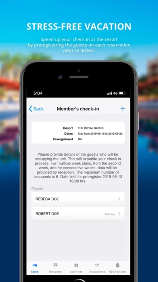 By using this App, keeping tabs on all your vacation transactions is easy and the results are immediate. You can register the members of your travel group prior to arrival. During your stay, check all your purchases and orders and confirm them the moment you make them. Before you check out you can even use the App to pay your bill with your credit card.