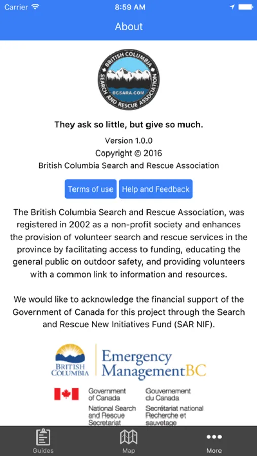 The 2500 search and rescue volunteers of British Columbia train for 10,000’s of hours each year in the latest techniques employed in search and rescue and this SAR Field Guide app will back up that training as an aide memoire to all the knowledge, techniques and guidelines that the volunteers are expected to know and regularly train in to remain current and safe.