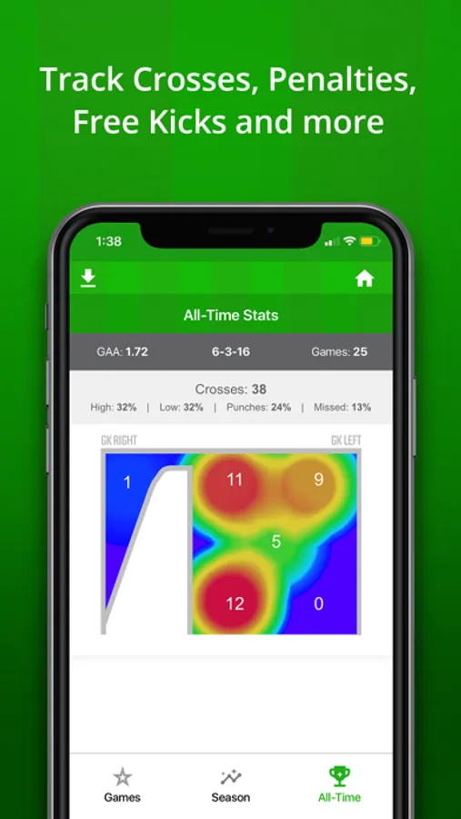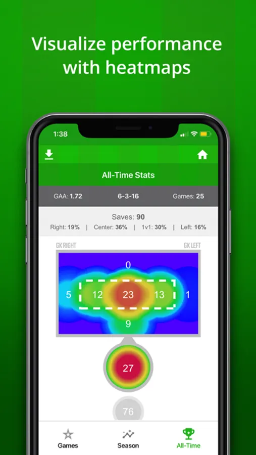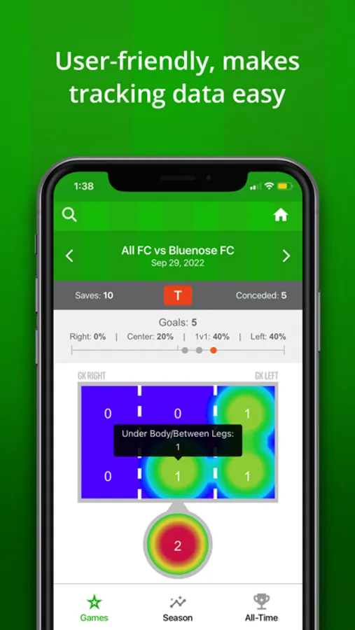 Take your goalkeeper training to the next level with Stopper. Track game data on Saves, Goals, Communication, Distribution and more. Heatmaps and charts help visualize trends and performance insights. Stopper stats let you identify strengths and weaknesses in your game, providing a complete overview of goalkeeper game performance.