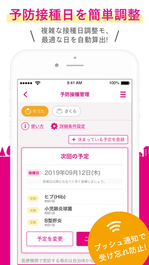 出生日と実際の接種日に応じて最適接種時期を自動で算出し、予定日が近づくと事前にお知らせします。