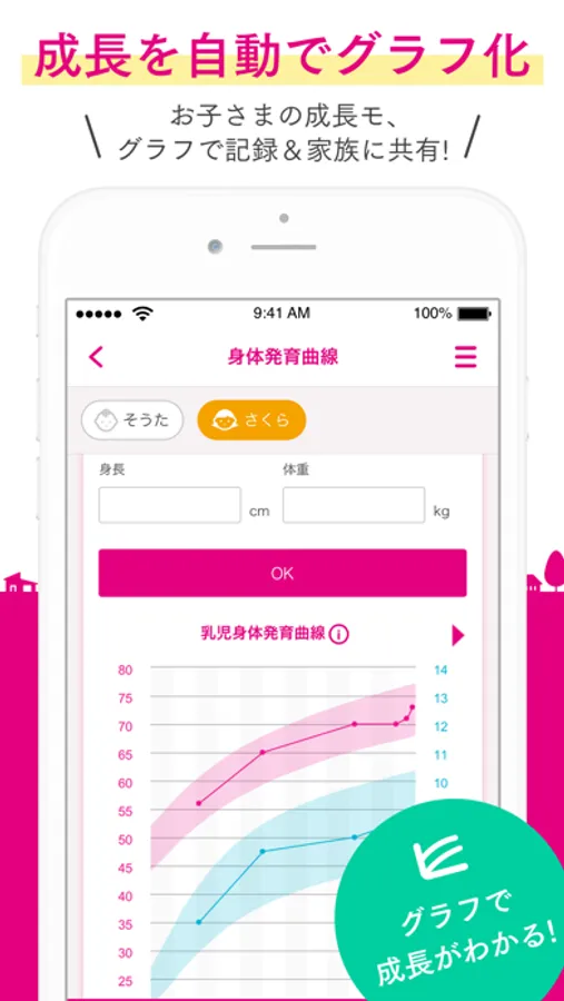 お子さまの身長/体重はもちろん、おなかの赤ちゃんの体重も簡単に記録&自動でグラフ化!