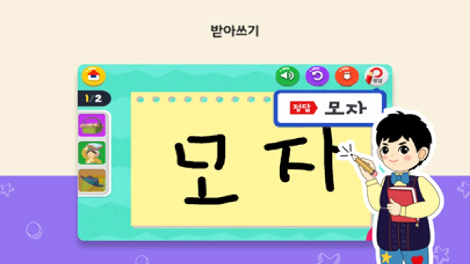1호: 한글 기본 모음체계 학습 – 한글의 기본 모음 체계를 익힐 수 있어요.