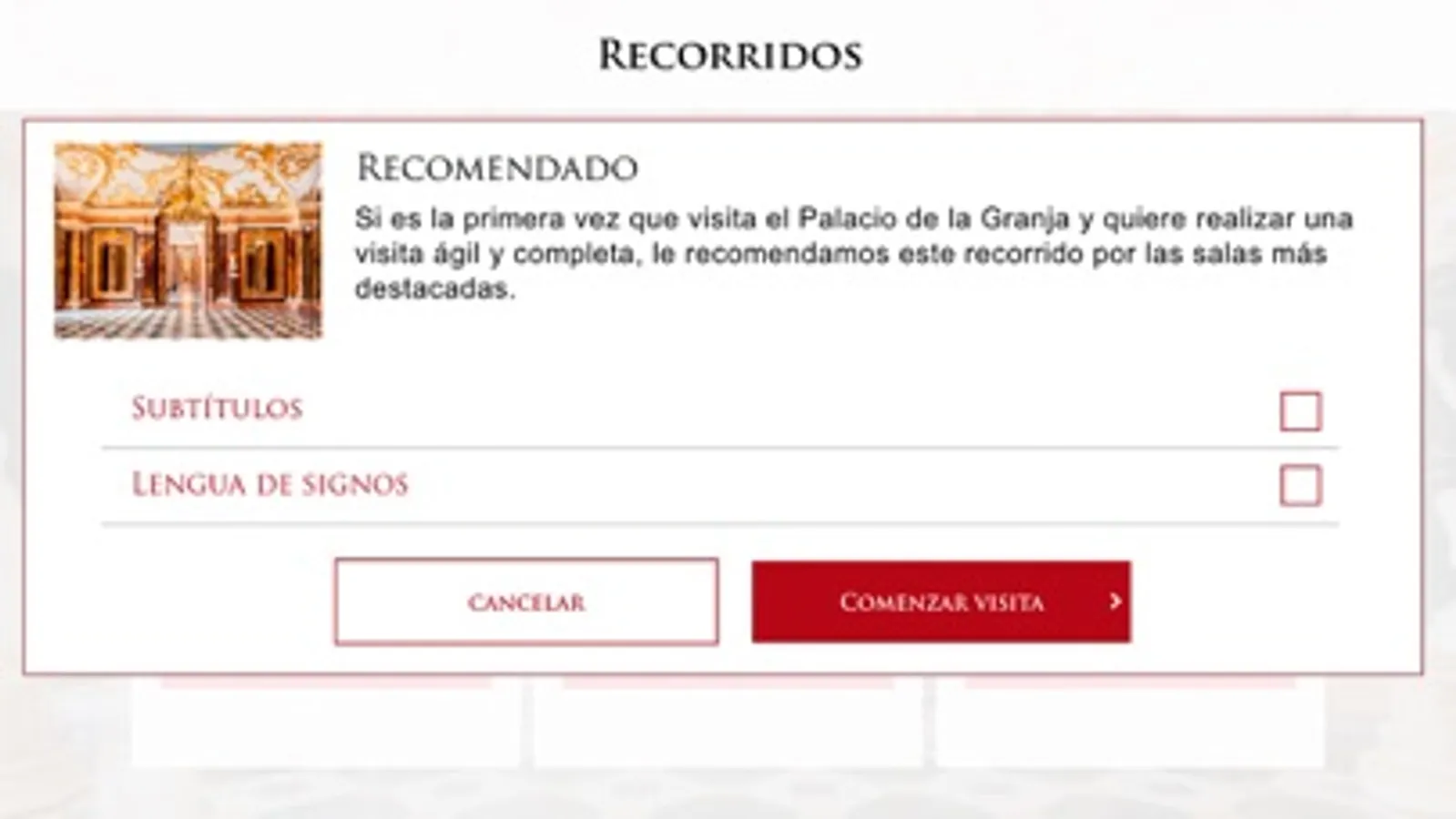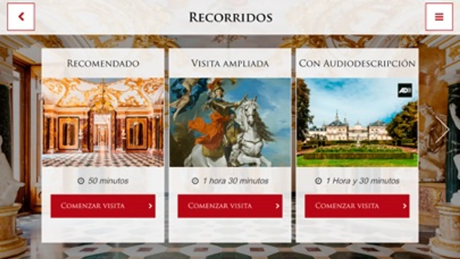 Descubre con esta audioguía oficial el pasado y presente del Palacio de la Granja de San Ildefonso, a través de vídeos, imágenes históricas y fotografías en alta resolución. ¡Podrás seleccionar el recorrido que más se adapte a tus gustos y tiempo disponible! Además, esta app incluye subtítulos, vídeos en lengua de signos y audiodescripciones para personas con discapacidad visual.