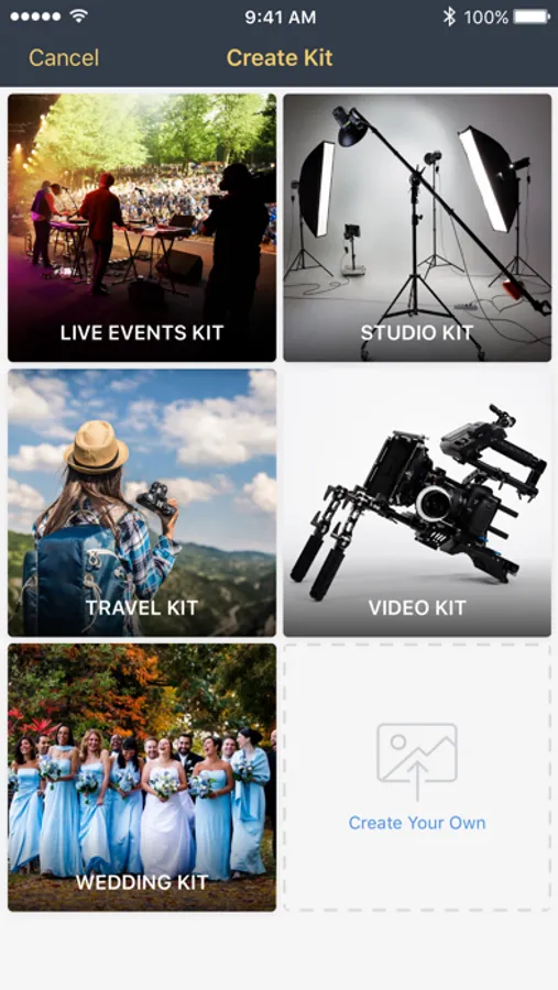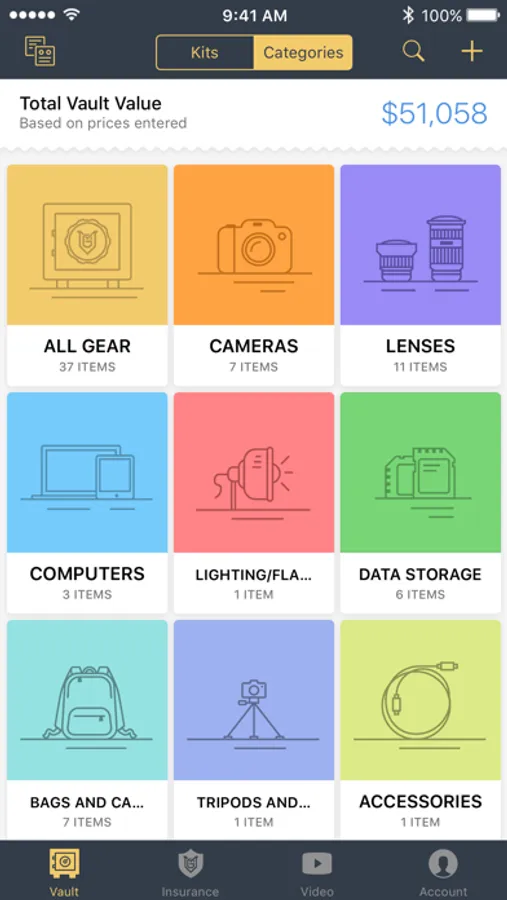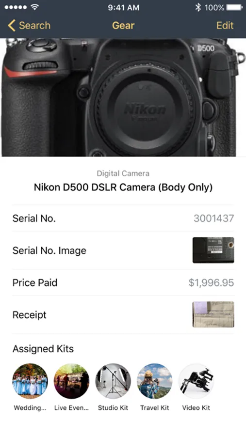 We know you have a lot of gear, that’s why we help you organize it in a few unique and effective ways. First, each item can be saved into a specific category (i.e. Cameras, Lens, Computers, Data Storage, etc.). When you click on a category, you will see the total value of items based on the gear inside. Secondly, you can create custom kits of gear, like a wedding kit, travel kit, studio kit, video kit and more. This is a great way to know the value of gear you’re taking with you.