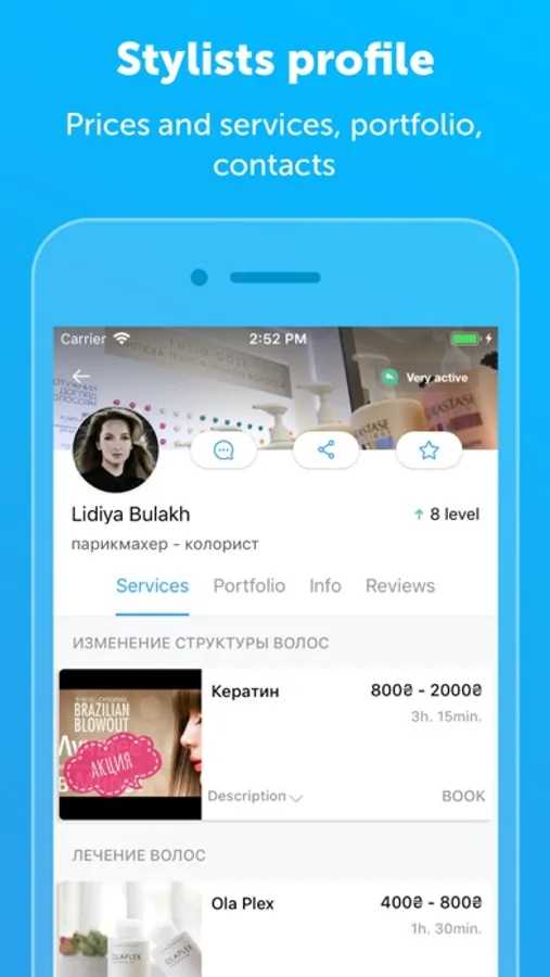 In the stylist's profile, you will see his portfolio, services, and their prices, location information, work schedule, payment methods available and brands that the pro works with, as well as reviews from his clients.