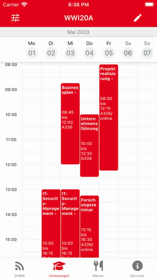 Nach Auswahl Eures Kurses erhaltet Ihr Zugriff auf den Online-Stundenplan mit den kommenden Vorlesungen inkl. Angabe des Namens vom Dozierenden, Zeit und Ort.