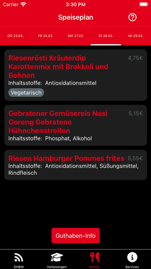 Hier seht Ihr den Speiseplan für die nächsten Tage. Je nachdem, welche Rolle Ihr auswählt, seht Ihr die entsprechenden Preise. Außerdem ist bei jeder Mahlzeit eine Liste der Zusatzstoffe hinterlegt. Sofern das Smartphone NFC unterstützt, könnt Ihr das aktuell auf der DHBW-Karte verfügbare Guthaben auslesen.