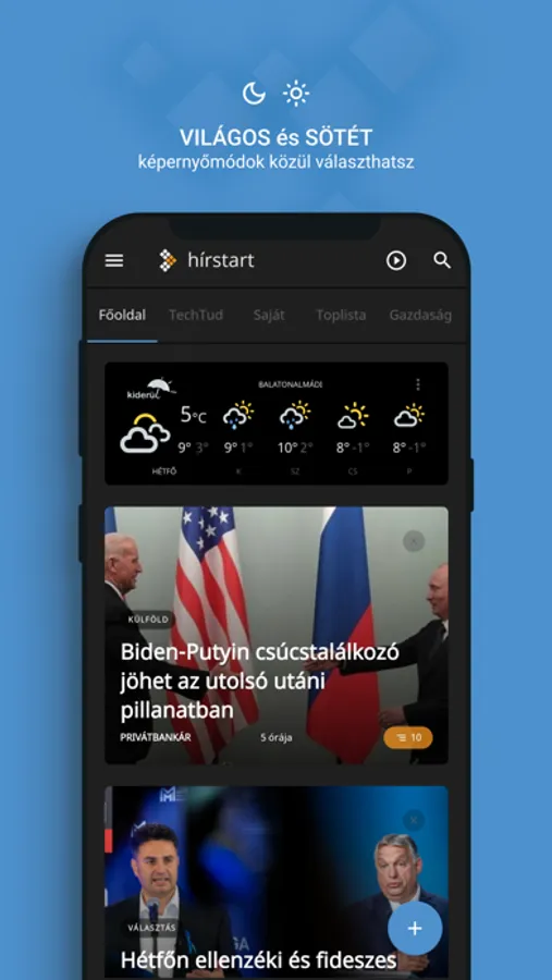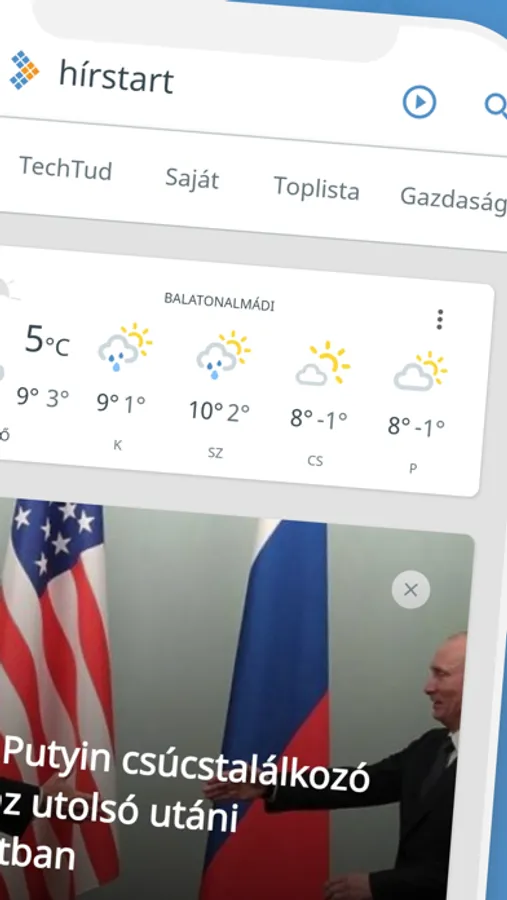 Itt minden hírnek helye van! A legfrissebb hírek egy helyen minden népszerű témában: közélet, külpolitika, belpolitika, gazdaság, életmód, sport, foci, forma 1, tudomány, infotech, mobiltech, zene, film, kultúra, időjárás, bulvár és sztárhírek, lottó és minden, ami az olvasókat érdekli. Olyan, mint egy RSS olvasó, sok-sok előre bekötött hírfolyammal. Olvasóink az időjárás előrejelzésről sem maradnak le. A Hírstart alkalmazás ingyenes és reklámmentes marad.