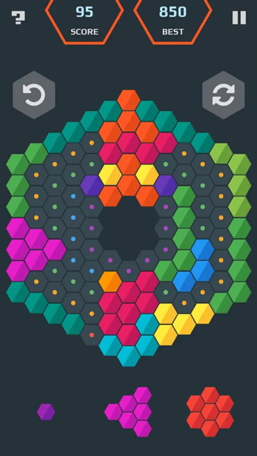 There are 5 logical ring on the game field, each ring marked by its own color. Place figures to game field to fill rings which will be cleared and you get score points. You can undo the last move and you can rotate figures. The game continues until you able to place at least one figure. Try to get as many points as you can.