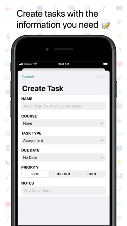 Tasks are the core of any type of planner. In Sigma Planner, tasks can be created for a course, on a date, with a different task type, priority, and more. Tasks should always be easy to find; with the built-in search and filter features, you will never lose a task.