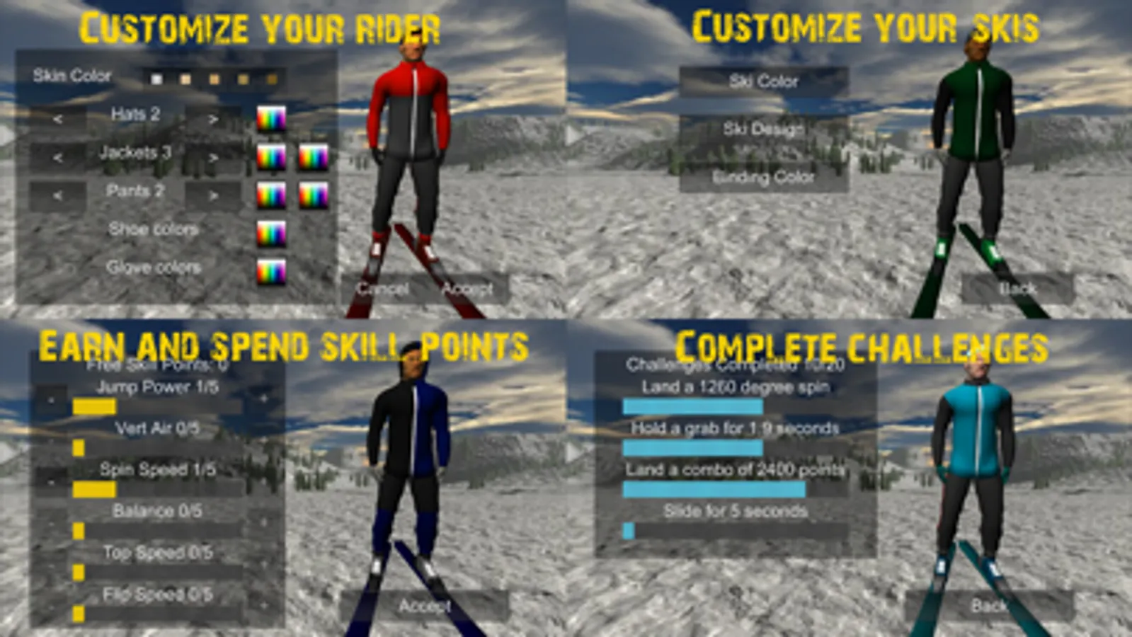 - Ride your skis, do awesome tricks, stunts, flips grinds and more!
