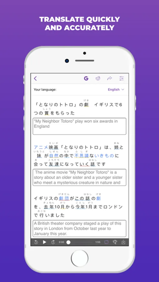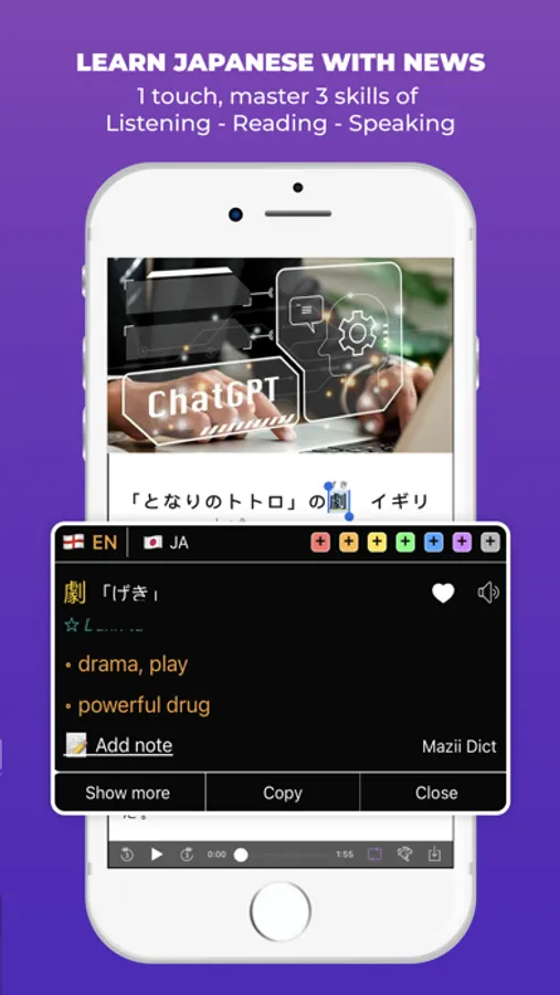 Adjust audio speed, change reading voice. Listen and repeat to improve listening and pronunciation skills. Practice listening and learning Japanese culture through videos and podcasts. Learn Japanese with music through Japanese songs for double fun.