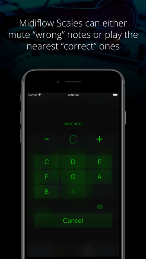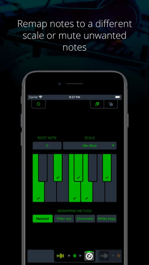 Midiflow Scales can not only mute "wrong" notes, which are notes outside of the scale, but it can also move those notes inside. The selector at the bottom lets you choose between filtering out those notes or remapping them to the nearest note that is part of the scale. If possible, the algorithm assigns the activated notes to the keys of the ionian scale. What sounds complicated actually makes it very easy for you to play different scales just with the white keys, or transform a stream of notes into a completely different scale.