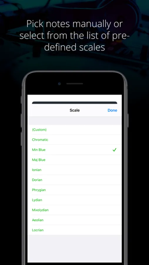 + Select from a list of predefined scales (Min/Maj Blue, Ionian, Dorian, ...)