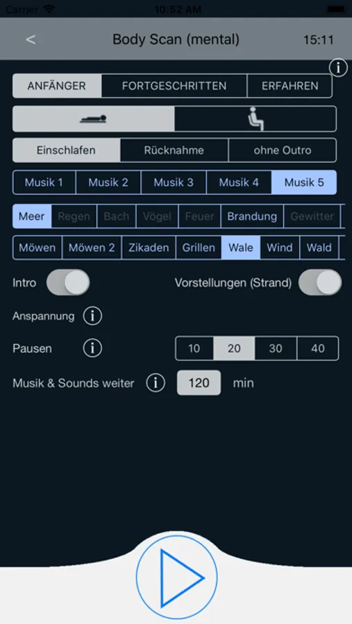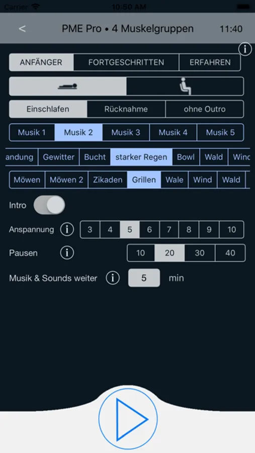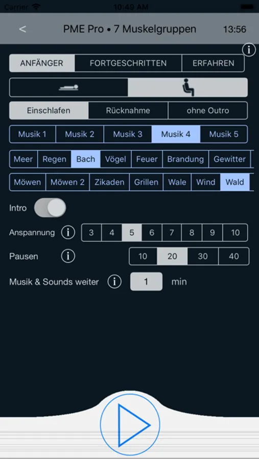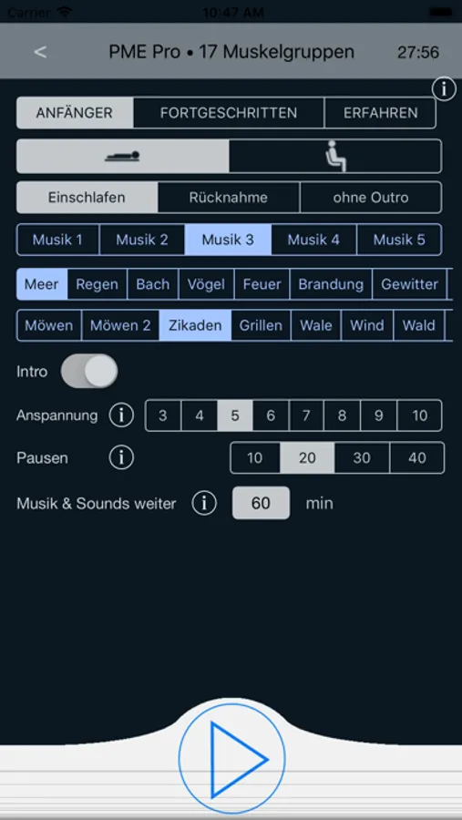 Auf alle Übungen kann eine beliebig lange Zeit für die Entspannungsmusik & Natur-Sounds eingestellt werden, die die Entspannung vertiefen.