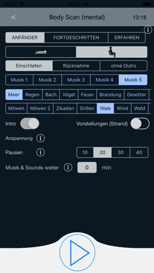 Es kann aus 5 Entspannungsmusiken und 18 Natur-Sounds gewählt werden, die sich jeweils untereinander und an die Lautstärke der Stimme anpassen lassen. Falls gewünscht können Musik/Sounds auch alleine (ohne Stimme) zur Entspannung bzw. zum Einschlafen genutzt werden. Es können auch 2 Natur-Sounds gleichzeitig kombiniert werden.