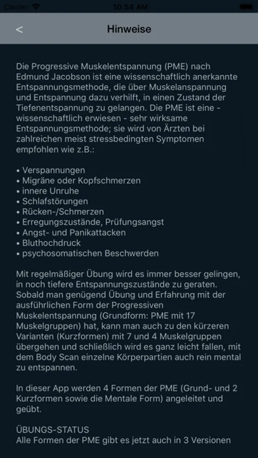 Die Progressive Muskelentspannung (PME) nach Edmund Jacobson ist eine wissenschaftlich anerkannte Entspannungsmethode, die über Muskelanspannung und Entspannung dazu verhilft, in einen Zustand der Tiefenentspannung zu gelangen. Die PME ist eine - wissenschaftlich erwiesen - sehr wirksame Entspannungsmethode; sie wird von Ärzten bei zahlreichen meist stressbedingten Symptomen empfohlen wie z.B.: