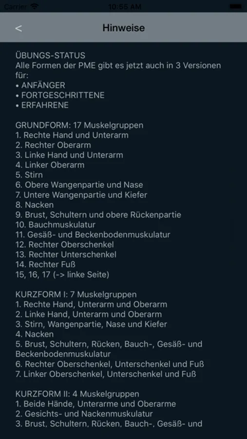 Mit regelmäßiger Übung wird es immer besser gelingen, in noch tiefere Entspannungszustände zu geraten. Sobald man genügend Übung und Erfahrung mit der ausführlichen Form der Progressiven Muskelentspannung (GRUNDFORM: 17 Muskelgruppen / ANFÄNGER-Status) hat, kann auch zu den kürzeren Varianten (Kurzformen) mit 7 und 4 Muskelgruppen übergegangen werden und schließlich wird es leicht fallen, sich bzw. auch einzelne Körperpartien mit dem Body Scan rein mental zu entspannen. Es sollte zu Beginn bei allen Formen der Übungsstatus ANFÄNGER gewählt werden.
