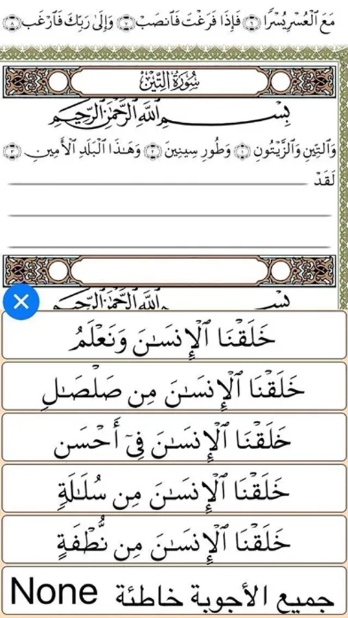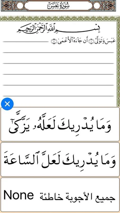 The application has more than three thousand tricky questions for each single juzu with options that are all derived from other similar ayat; and this in fact, stresses the miraculous eloquent style of the Qur'an Kareem wording.