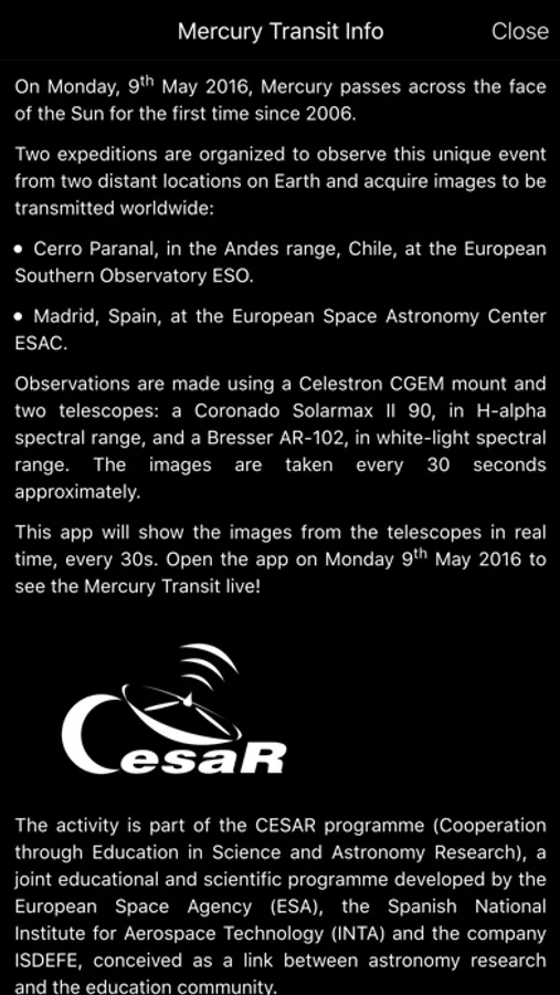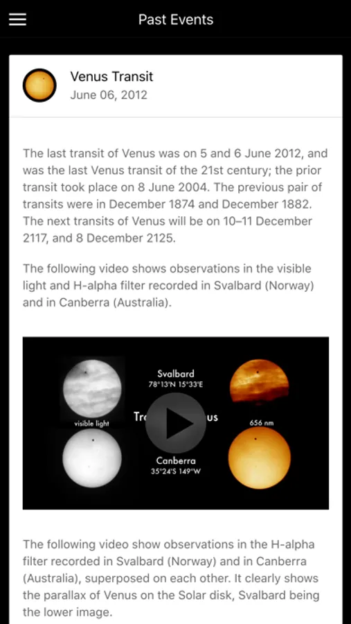 The app also shows some of the best time-lapse videos of the Mercury Transit that occurred on May 9th and the Venus transit in 2006.
