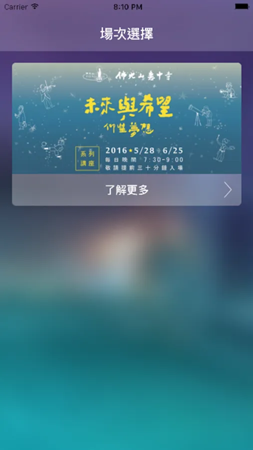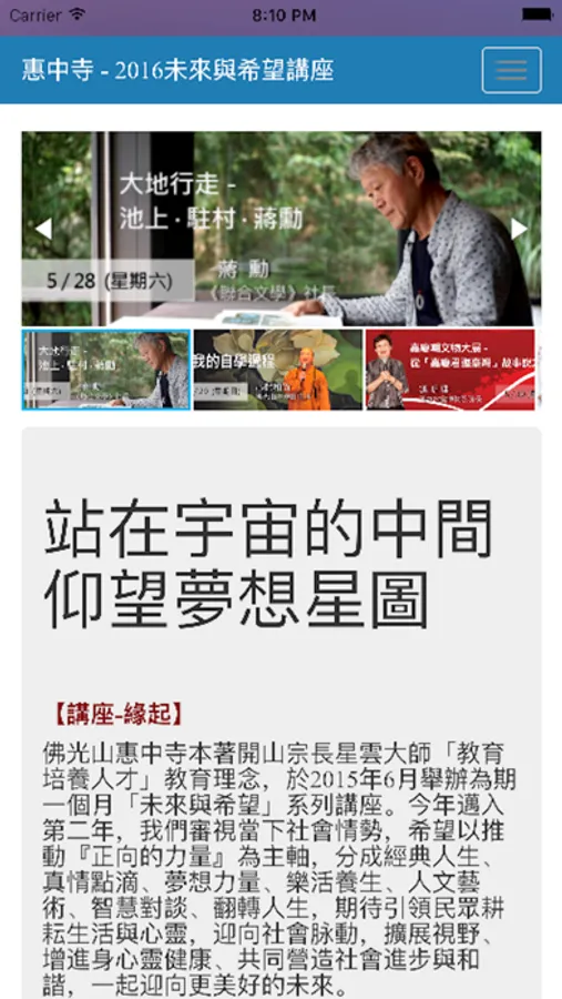 本APP由佛光山惠中寺建置,主要用於”未來與希望系列講座”使用,