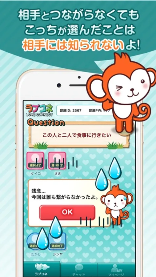 マッチングが失敗した場合、選んだことは相手にわからない仕組みだよ。いろいろな質問にどんどん答えてみよう!