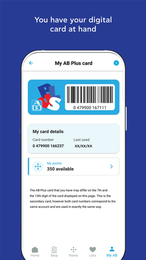 Connect AB Plus to your account to earn points with your online purchases and always have it on hand on your mobile phone.