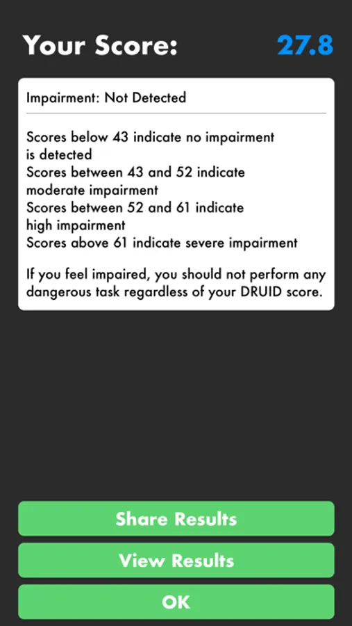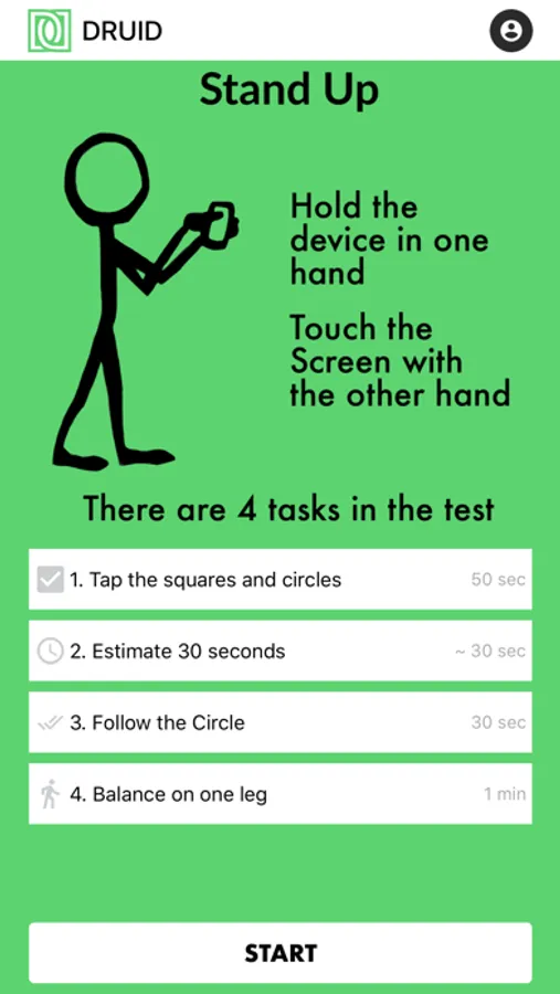 DRUID is a test for personal and workplace use that measures impairment of cognitive and motor functions. Users chose between either the 1-minute Rapid Druid Test or the 3-minute Benchmark Druid Test.