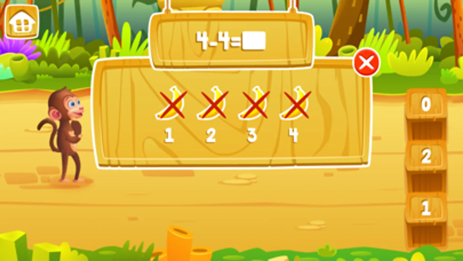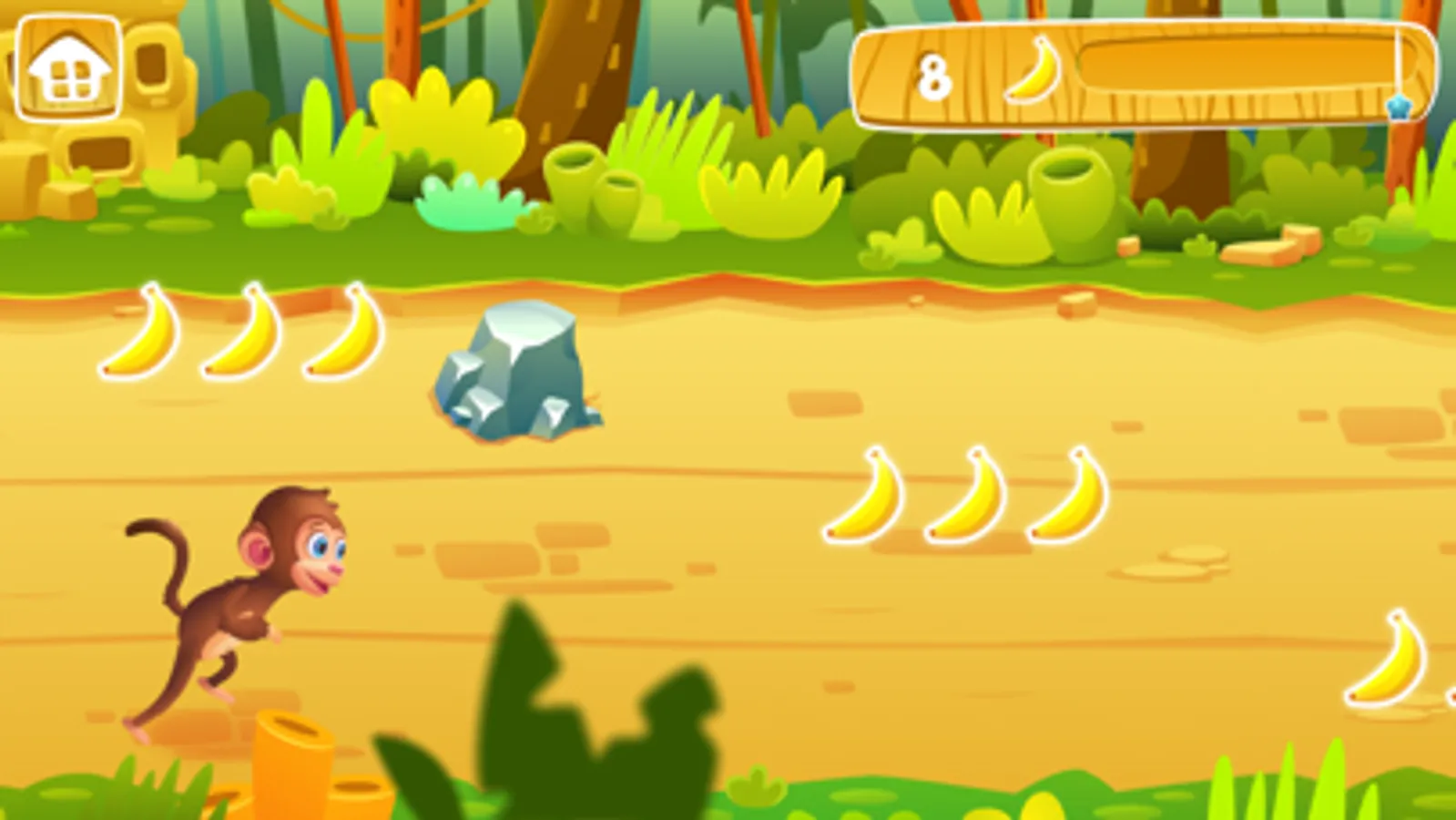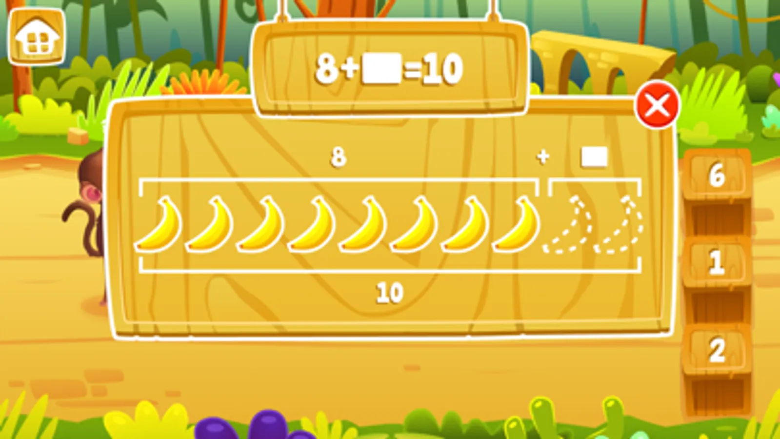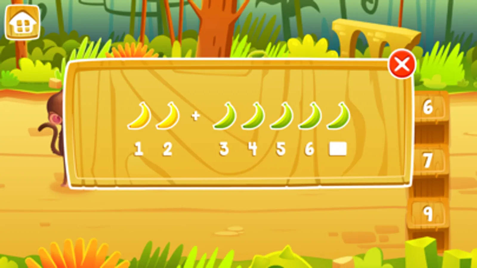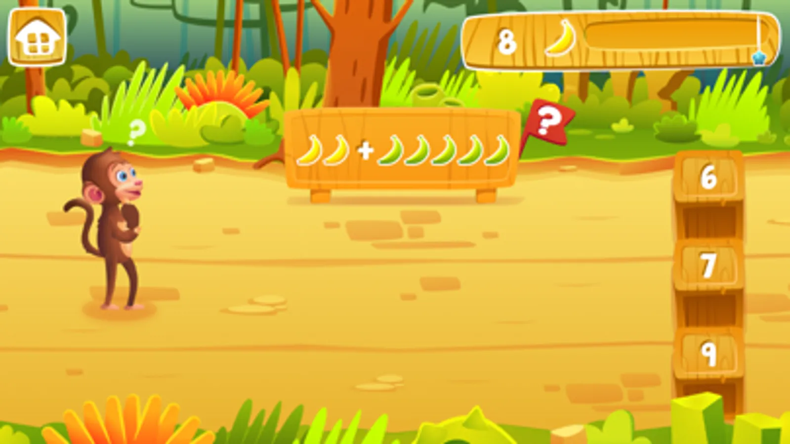 Your child will help a monkey collect bananas in a jungle. Most bananas are collected by solving math problems. Other bananas are collected through simple game play. The game includes a high score feature. This provides motivation for your child to improve. Higher scores are achieved by answering correctly. This provides incentive to focus on getting the correct answer.