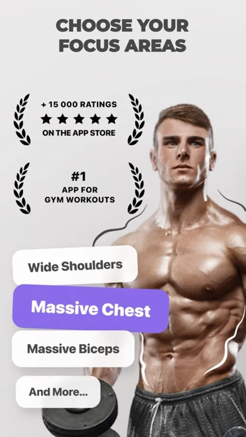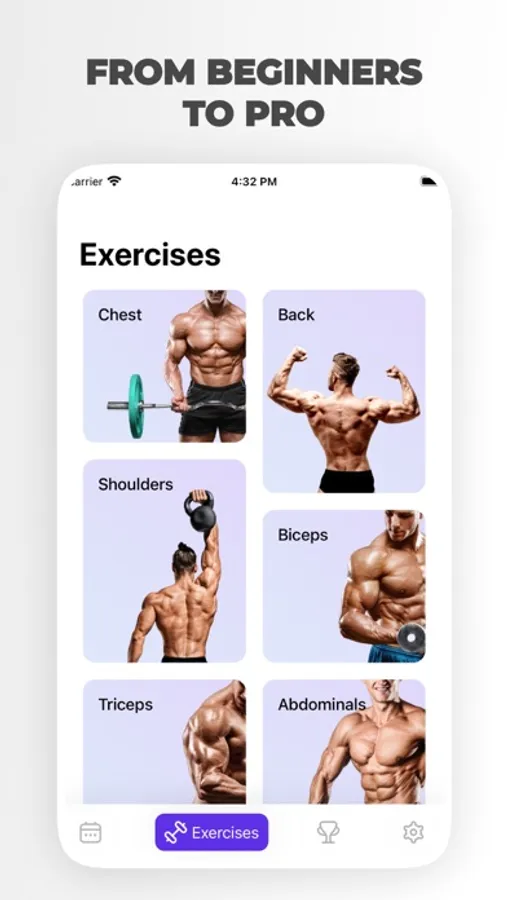 • Workouts for building biceps, getting wide back, shoulders, chest, strong legs, and more.