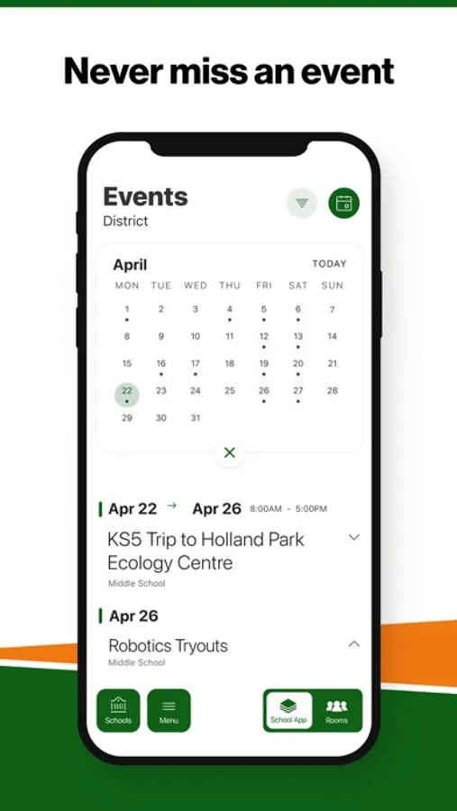 The event section shows a list of events throughout the district. Users can add an event to your calendar to share the event with friends and family with one tap.