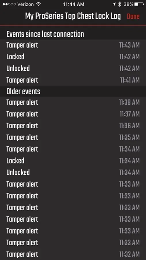 Once in range the lock's tamper monitor will send notifications that your tool chest had been tampered with (while locked) alerting you to check your tool chest and tools. The app allows your to set the sensitivity from low to high based on your preference. It will also will keep a log of all lock, unlock, and tamper activity.