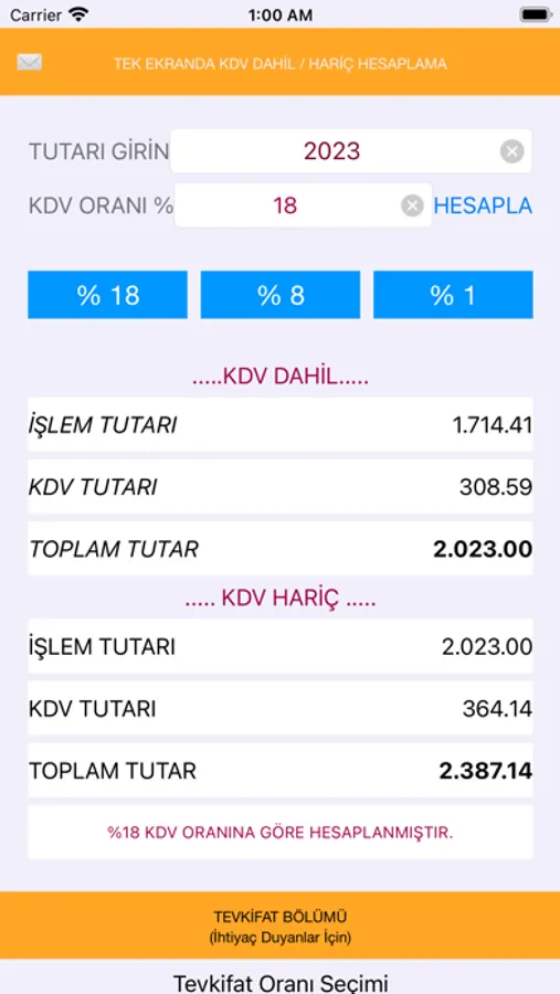 Ekranın sol üst köşesinde beliren mektup zarfı simgesine dokunarak ekrandaki KDV hesaplama bilgilerinizi mükelleflerinize veya diğer ihtiyaç duyanlara kolayca iletebilirsiniz. (Şimdilik sadece tevkifatsız hesaplama için kullanılabilmektedir.)