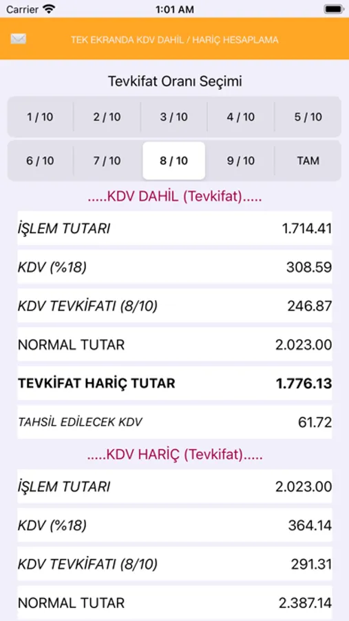 KDV Tevkifatı hesaplamak isteyenler ekranı kaydırarak kolayca hesaplama yapabilirler. Tevkifat oranına dokunmak yeterlidir.