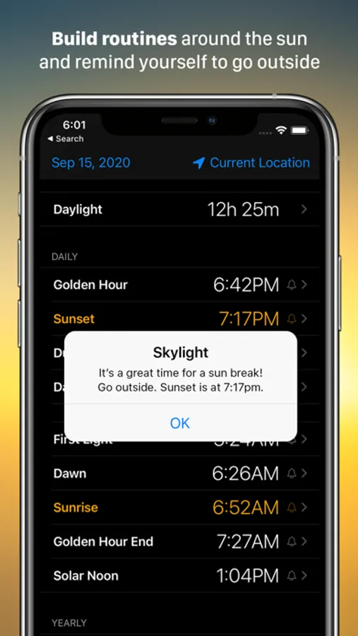 Create a routine around sunrise every morning. Remind yourself to step out at solar noon for a sun break. Take better photos by shooting during Golden Hour. Start getting outside to see the sunset more. Gain a better sense of sunlight lost and gained through the seasons and adjust your routine to make sure you get enough light. Motivate yourself through the winter months by reminding yourself that days are getting longer. The uses are endless but the goal is the same - better living through more sunlight.