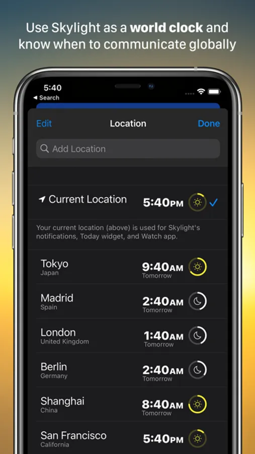 - Skylight can optionally use GPS in the background to ensure notifications are correct even if you change location.