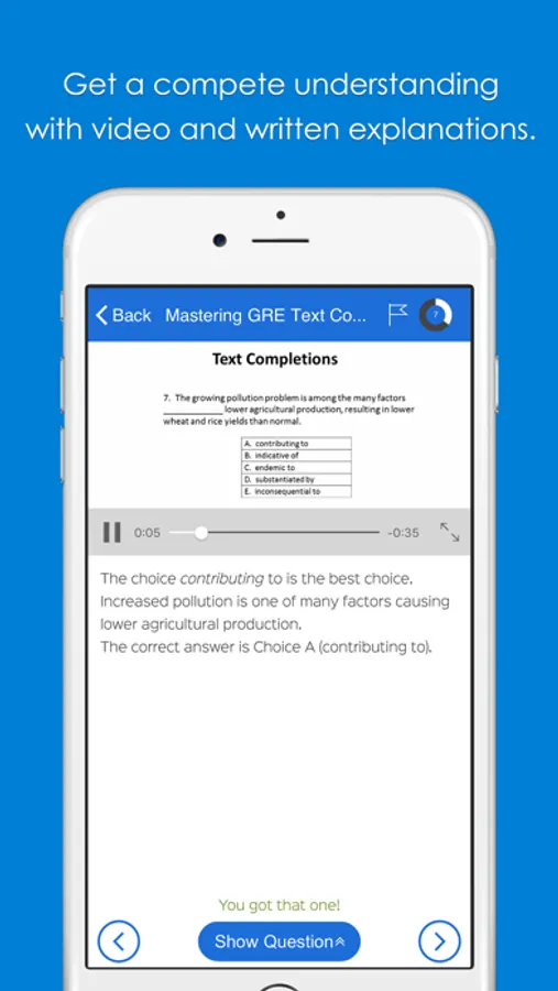 With PrepEd’s unique video and text explanation system, you gain a detailed understanding of every question. This includes the background concepts, the theory, and the most effective tricks and shortcuts. This arms you with the knowledge and skill to tackle anything the GRE exam throws at you.