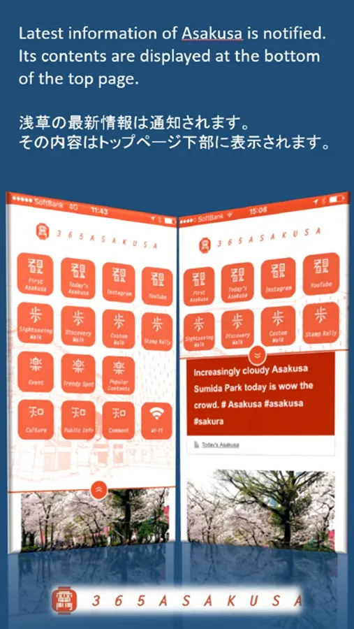 Top page displays each function to the icon.At the bottom of the slide bar, the latest information of Asakusa is displayed.With slide bar, you can see the text and photos.Then introduces the function of each icon.