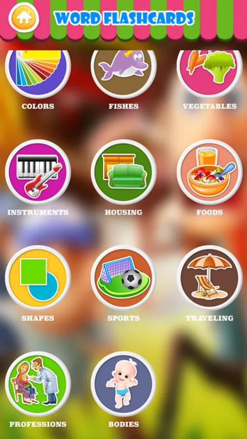 Word Flashcards part with 500 Flashcards in 20 topics which designed carefully that suit for Kids's Learning. Beautiful pictures, audio and sound with touchable objects can make children like to learn new things.