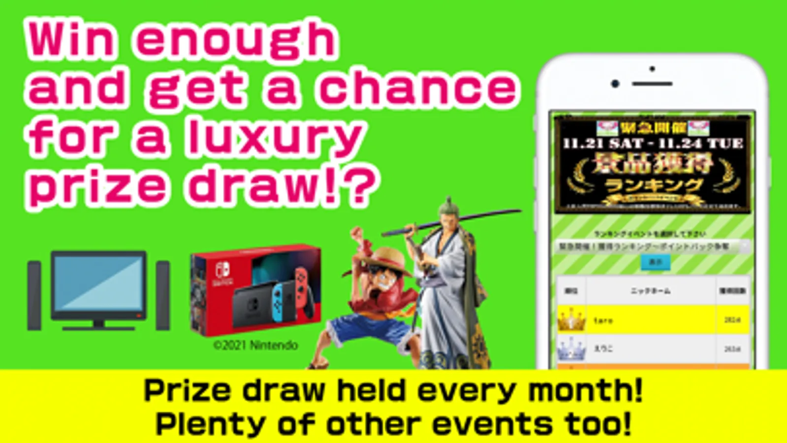 A great variety of prizes, including action figures and plush toys of popular Japanese anime characters, items of the hottest trends, candies, snacks, and many more arrive every day.