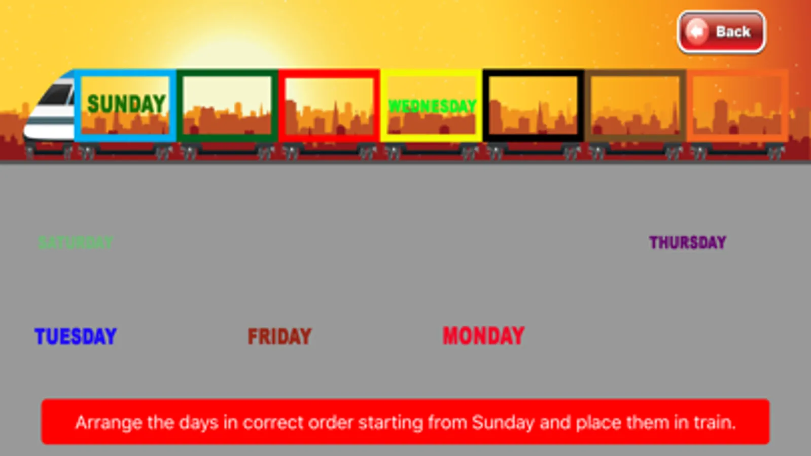 5). Arrange the days. Many people think that children don't remember the the days in early ages. We disagree. This activity will help the child remember the days in sequence. We understand that child can not read the days names, so please keep the volume high so as the child picks the day he knows by sound what day it is.