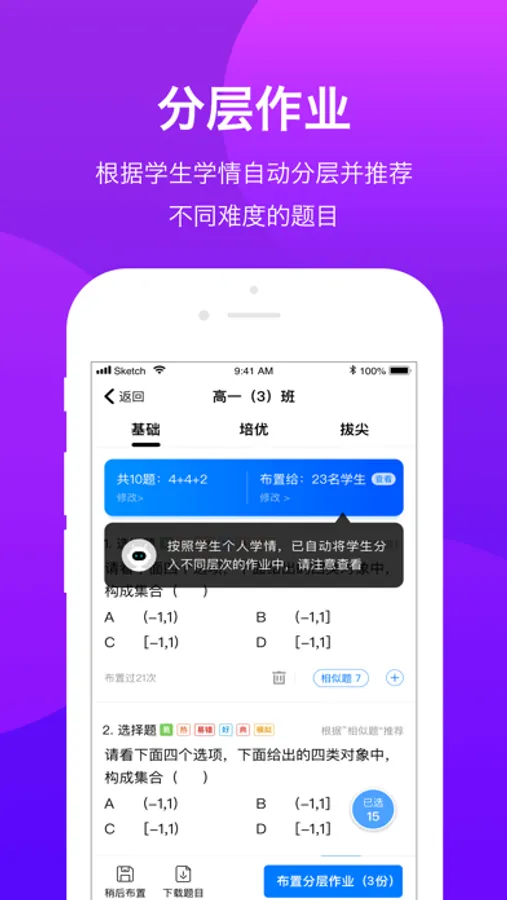 根据学生学情自动生成分层作业,不同层次的学生做不同难度的题目,因材施教