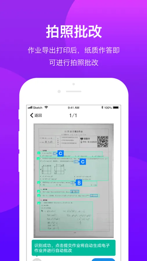 作业布置成功后,可在线作答也可将作业导出打印,学生作答后进行拍照上传,系统会自动进行识别并批改。