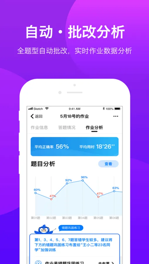 当班级作业中题目正确率低于60%时,系统会自动向您推荐该题的相似题,进行举一反三练习,达到错题巩固效果。