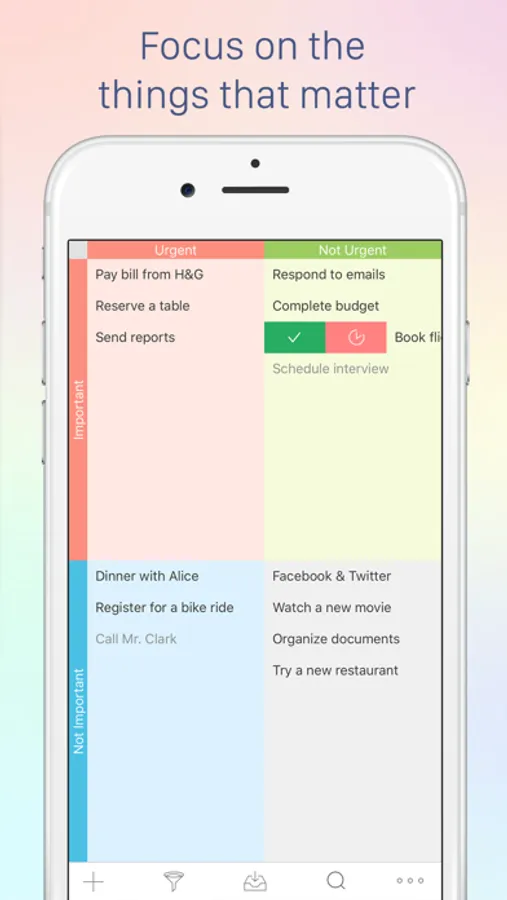 Focus Matrix is a smart personal organizer based on the so-called Eisenhower box, a personal productivity strategy created by Dwight Eisenhower, the 34th President of the United States. The principle uses a special priority matrix that helps break your tasks into several groups depending on their urgency and importance, and work your way through your daily agenda in the most efficient way possible. This app will help you focus on what really matters, and get rid of the things that can be painlessly delegated to others or postponed indefinitely until you have time for them.