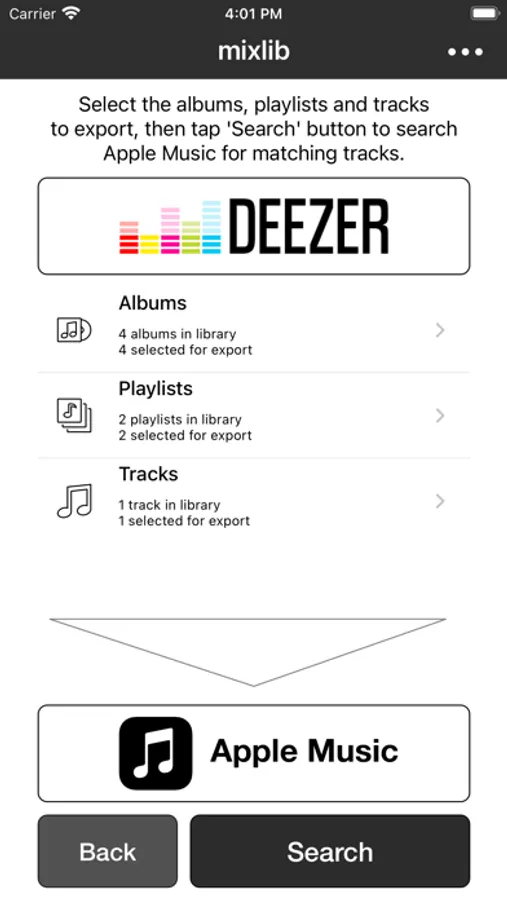 Mixlib can transfer playlists, favorites albums or favorites tracks between these streaming services: