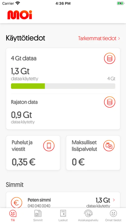 Moin käyttäjät voivat muokata itse omia palvelujaan, tilata uusia liittymiä, laajentaa pakettia tai poistaa palveluja sekä seurata paljonko jokainen oman tilin simmi kuluttaa puhetta, viestejä tai dataa. Mun Moissa on siis aina reaaliaikainen näkymä kaikkien oman tilin simmien kulutukseen. Kuulostaa reilulta, eikö?