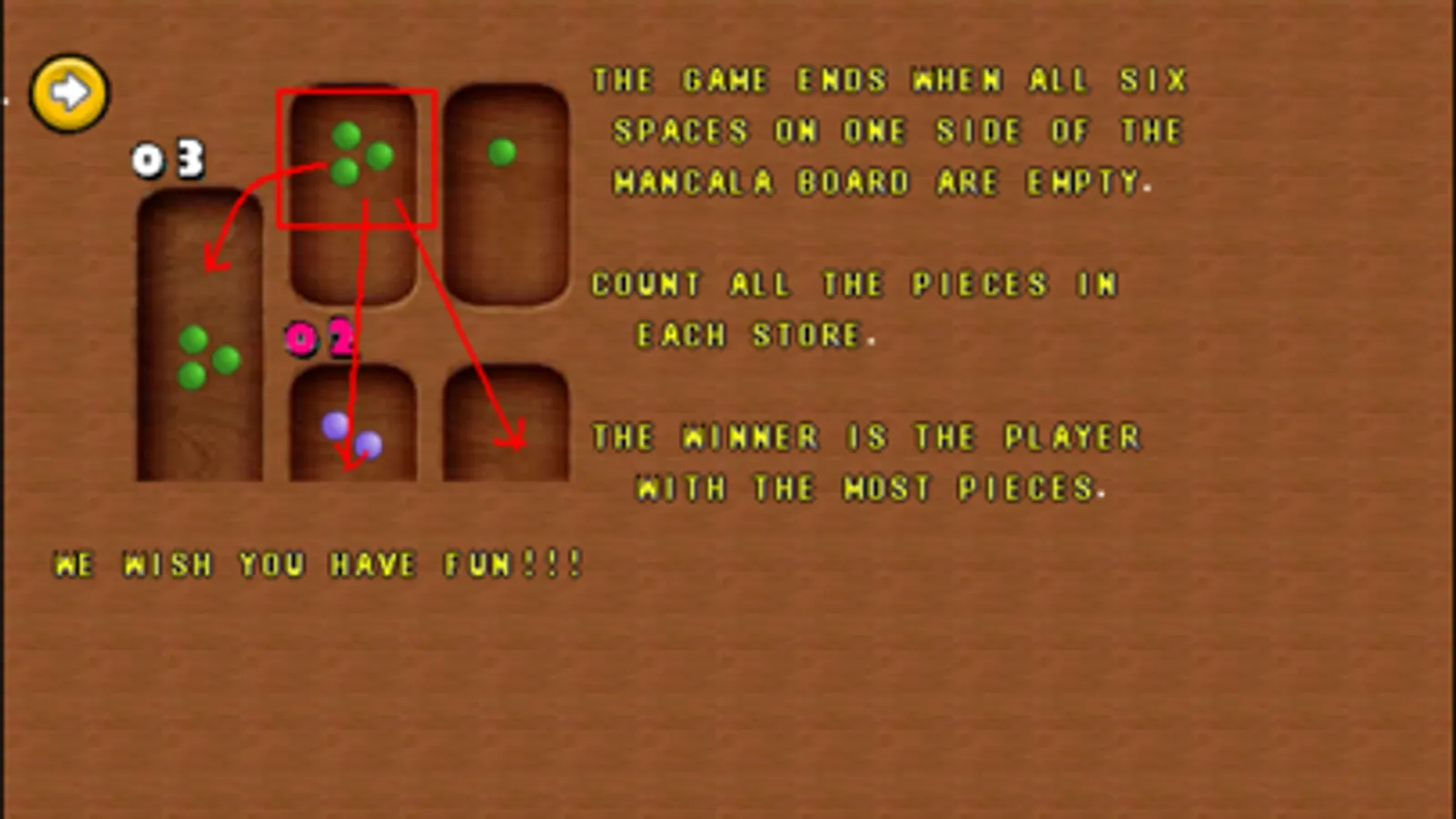 The game ends when all six spaces on one side of the MANCALA board are empty.