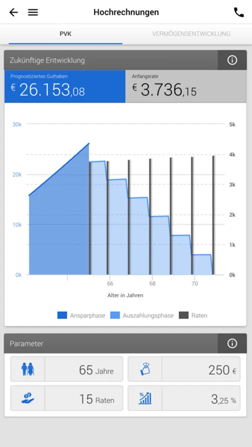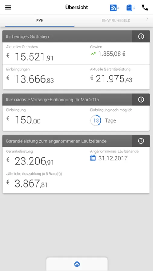 Behalten Sie Ihre Vorsorge und deren Entwicklung im Auge. Simulieren Sie Ihr Einkommen im Rentenalter, rufen Sie aktuelle Kontenauszüge ab und sorgen Sie aktiv für Ihr Alter vor. Die BMW Altersvorsorge-App ermöglicht Ihnen den einfachen Überblick über Ihre Vorsorgemodelle, mobil und rund um die Uhr.
