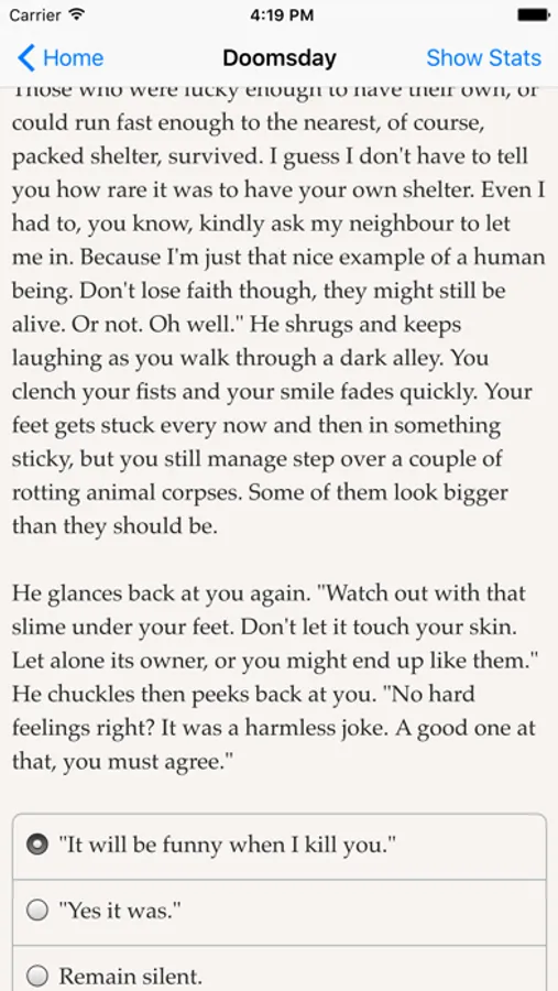 "Doomsday on Demand" is an interactive novel by Norbert Mohos. Your choices control the story. It’s entirely text-based–102,000 words, without graphics or sound effects–and fueled by the vast, unstoppable power of your imagination.